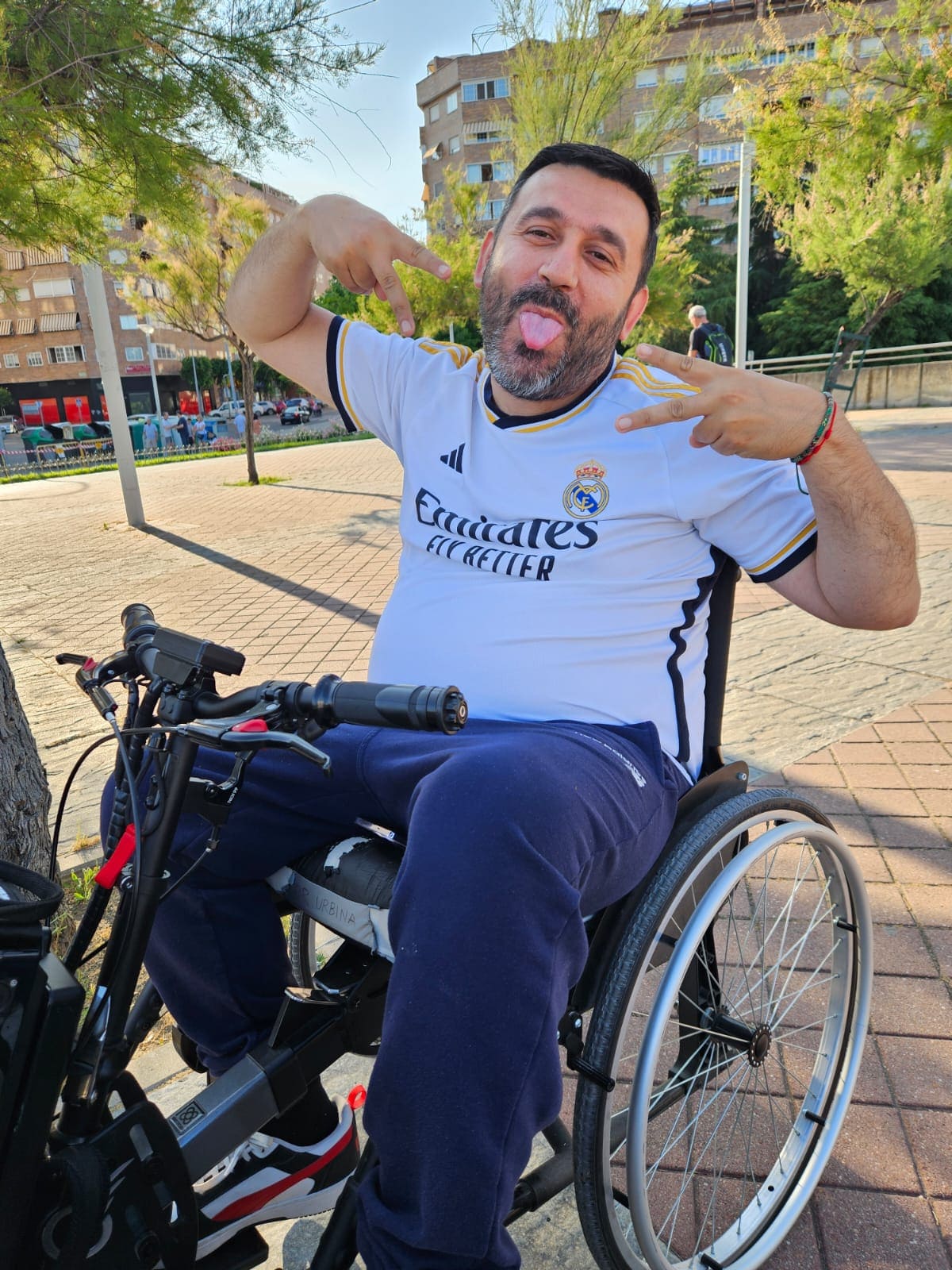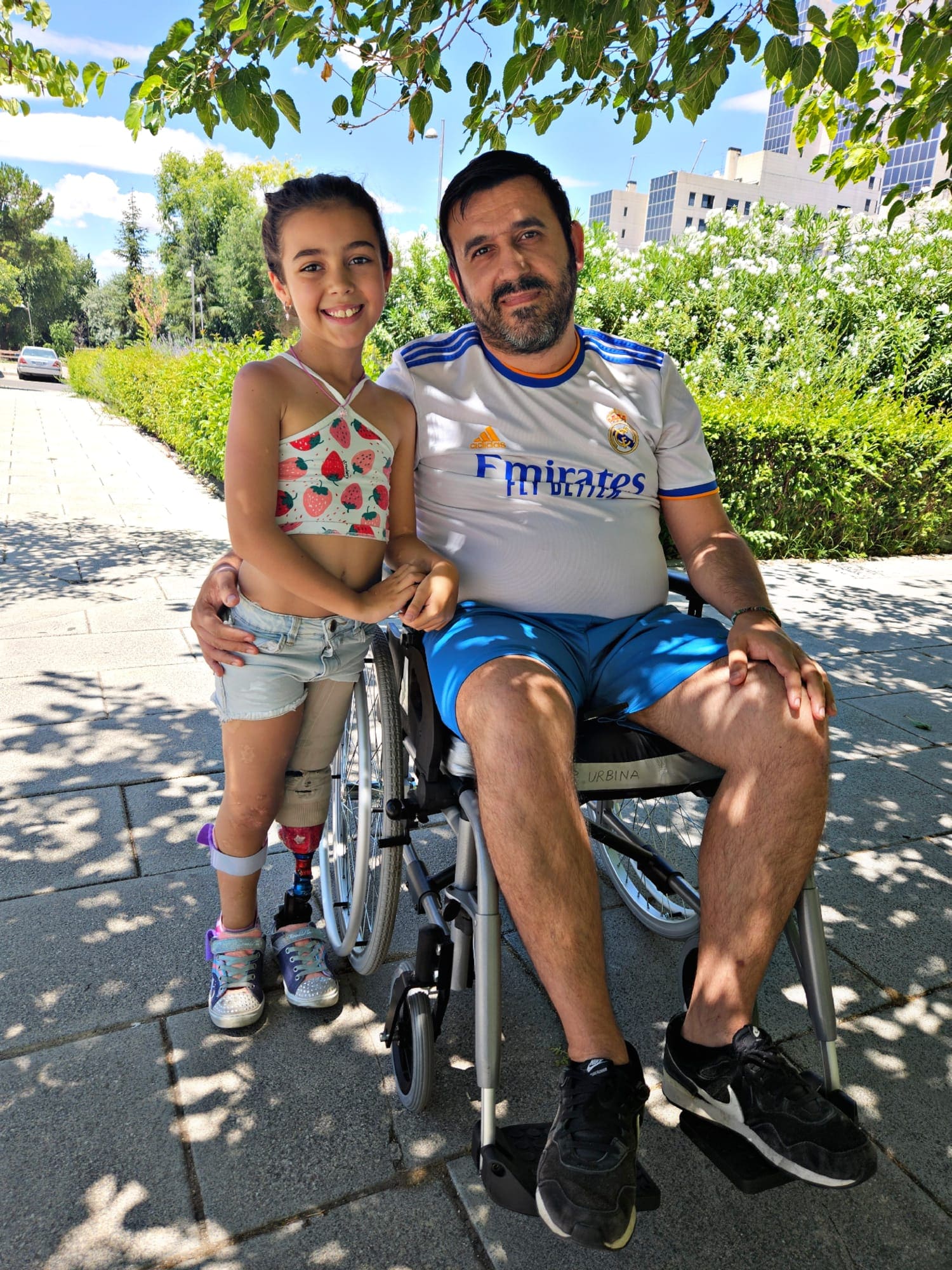 Tres años después del diagnóstico de meningitis bacteriana de Aitana, la vida volvió a poner a prueba la fortaleza de esta familia de Madrid a través de la enfermedad de Fran: «Nos tenía otra sorpresa preparada», lamenta Joana. En 2023, tras notar cómo perdía progresivamente movilidad y sensibilidad de pecho hacia abajo, las pruebas radiológicas revelaron la presencia de un tumor maligno de dieciséis centímetros que le comprimía la médula, lo que explicaba la pérdida de sentido al tacto. No obstante, Joana todavía recuerda el momento en el que su vida volvería a empezar, de nuevo, a convivir con la discapacidad, en este caso personificada a través de una lesión medular que privó a su marido de caminar le obligó a estar sentado en una silla de ruedas rozando los cuarenta años de edad: «La vida volvió a darnos un giro«. Realmente no resulta esencialmente escuchar las palabras de Joana y no ser empáticos con su historia, pero es más sencillo -si cabe- expresar admiración por la manera de afrontar una vida que los ha puesto en serios apuros.